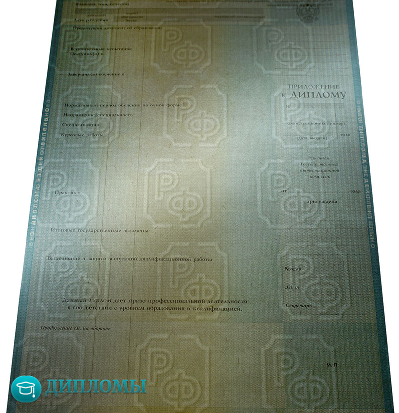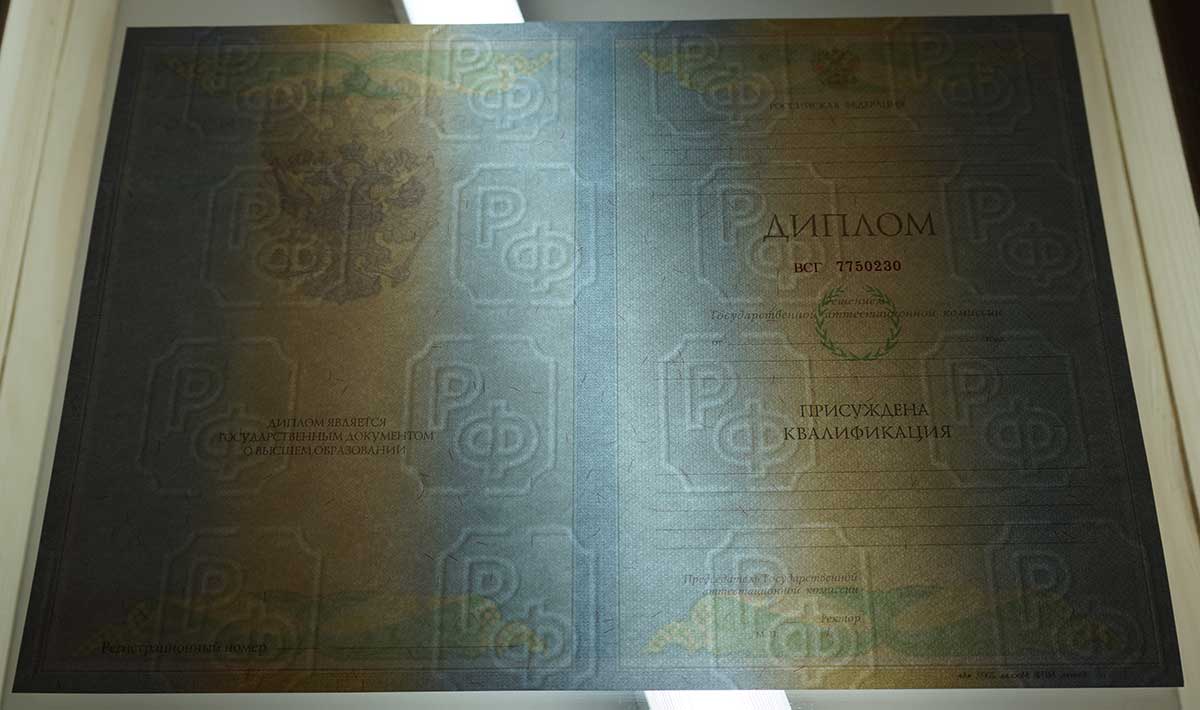 Дипломы изготавливаются на государственных бланках, имеют высокое качество и защитные элементы. Компания RusDiplomy сотрудничает с большим количеством ВУЗов в стране, поэтому не является проблемой получить бланки конкретного учебного заведения, с подписями от уполномоченных сотрудников.